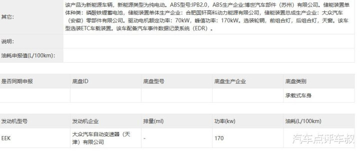 动力方面,此次申报的版本为单电机后驱,搭载一台由大众汽车自动变速器(天津)有限公司提供的170kW驱动电机,与旗下与众06保持一致。电池则采用国轩高科提供的磷酸铁锂电池。虽然目前仅申报了单电机版本,但参考产品布局,未来极有可能推出双电机四驱高性能版。